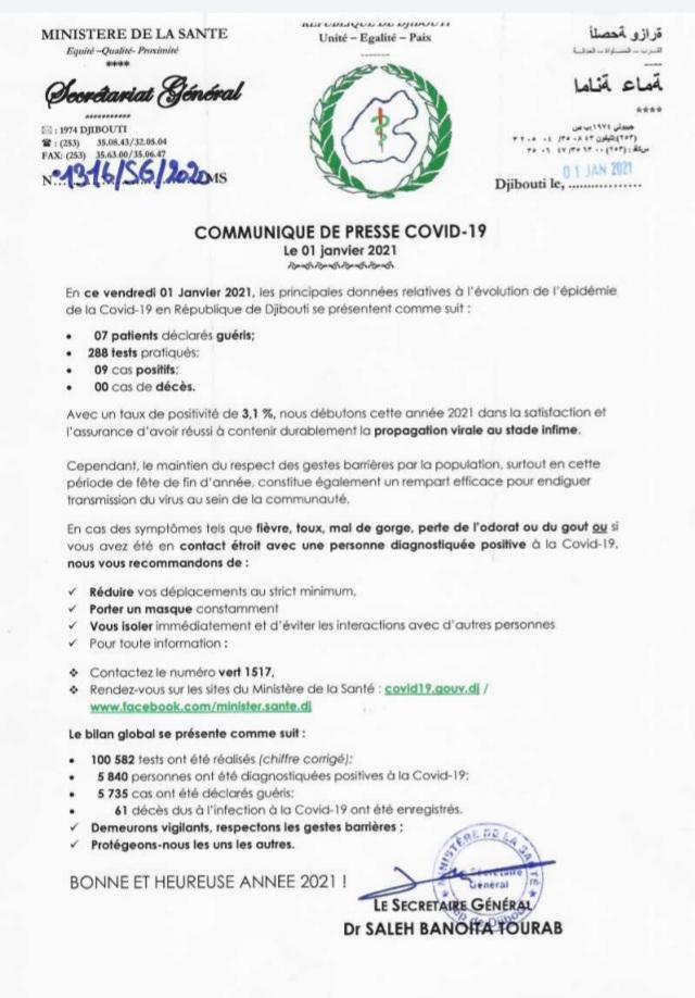 Coronavirus - Djibouti : Point de Presse sur la Situation COVID-19 le 1 janvier 2021