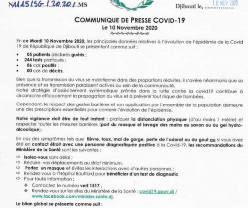 • Coronavirus - Djibouti : Point de Presse sur la Situation COVID-19 le 10 novembre 2020