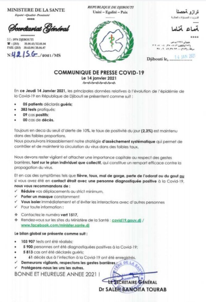 • Coronavirus - Djibouti : Point de Presse sur la Situation COVID-19 le 14 janvier 2021