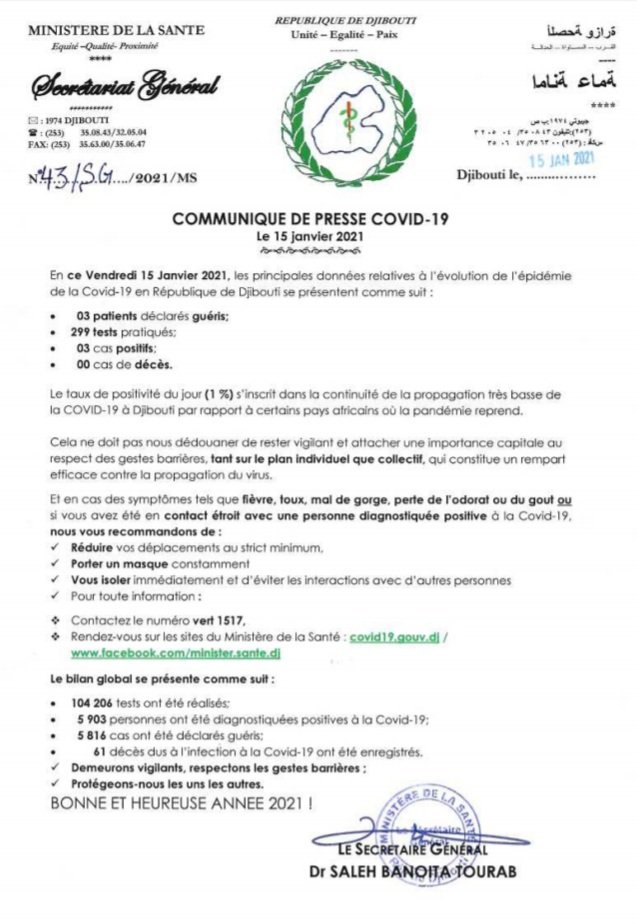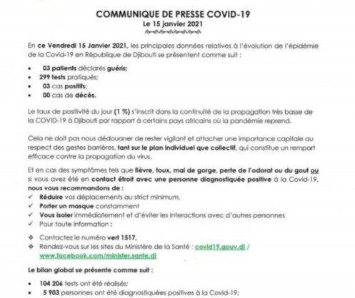 • Coronavirus - Djibouti : Point de Presse sur la Situation COVID-19 le 15 janvier 2021