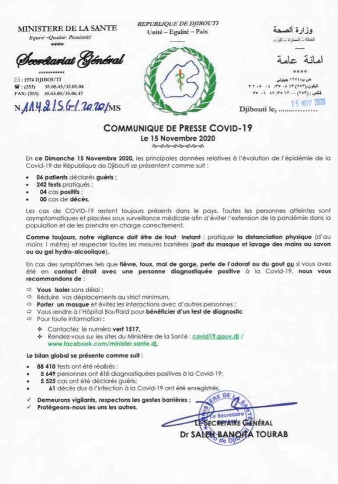• Coronavirus - Djibouti : Point de Presse sur la Situation COVID-19 le 15 novembre 2020
