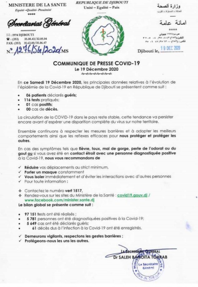 • Coronavirus - Djibouti : Point de Presse sur la Situation COVID-19 le 19 décembre 2020