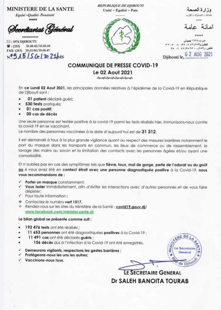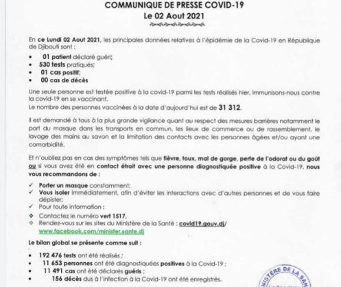 • Coronavirus - Djibouti : Point de Presse sur la Situation COVID-19 le 2 août 2021