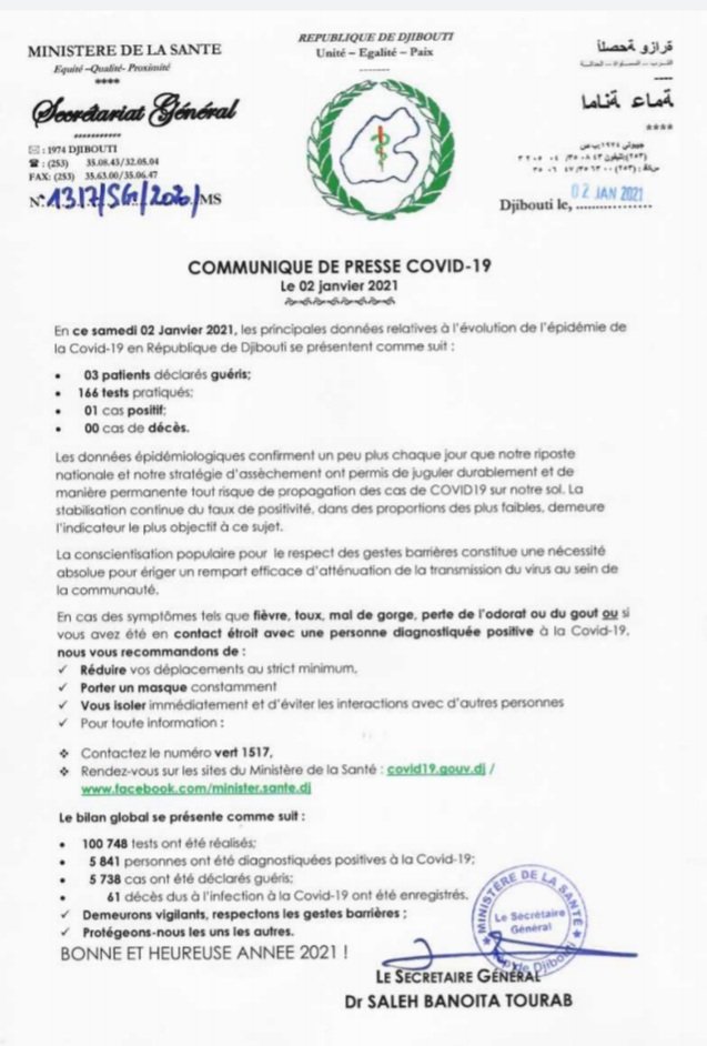 • Coronavirus - Djibouti : Point de Presse sur la Situation COVID-19 le 2 janvier 2021