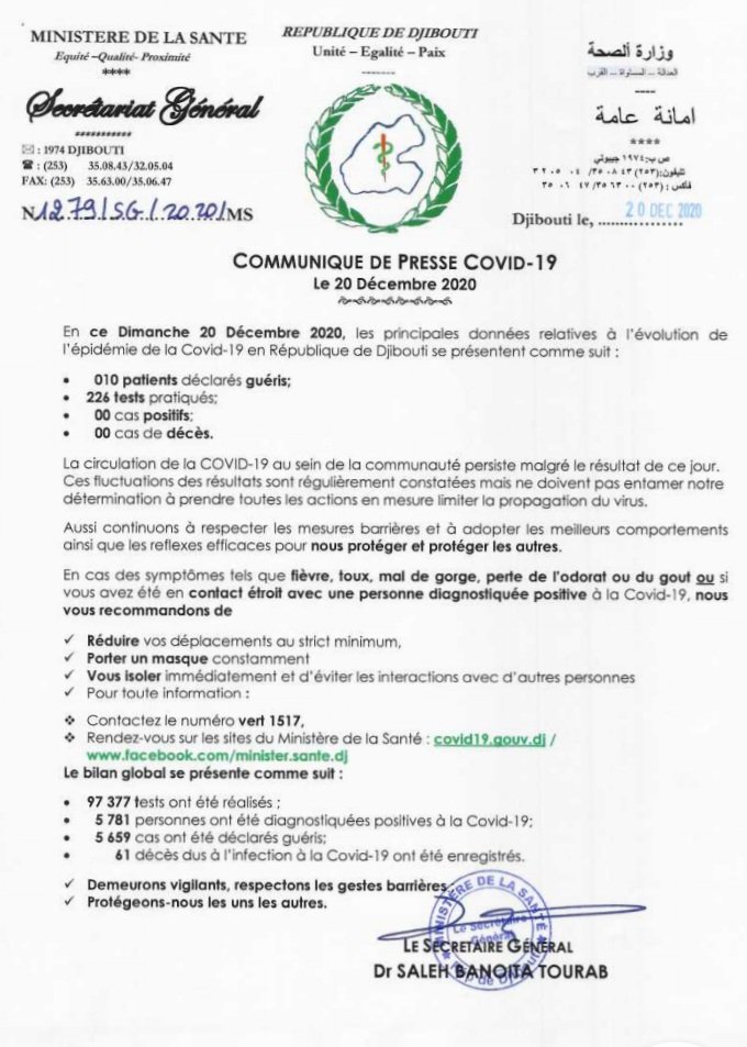 • Coronavirus - Djibouti : Point de Presse sur la Situation COVID-19 le 20 décembre 2020