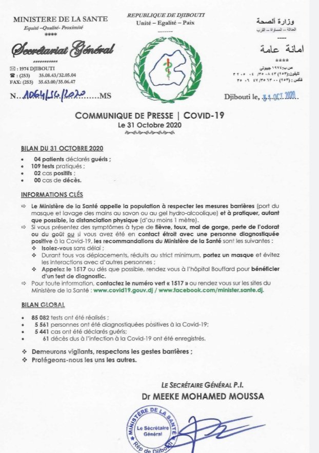 • Coronavirus - Djibouti : Point de Presse sur la Situation COVID-19 le 31 octobre 2020