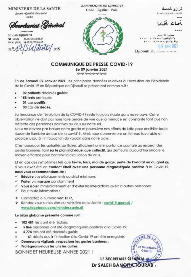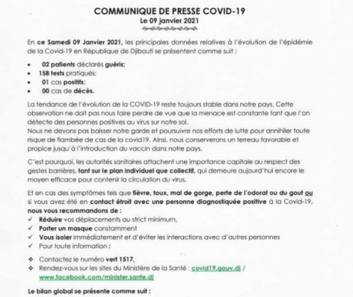 • Coronavirus - Djibouti : Point de Presse sur la Situation COVID-19 le 9 janvier 2021