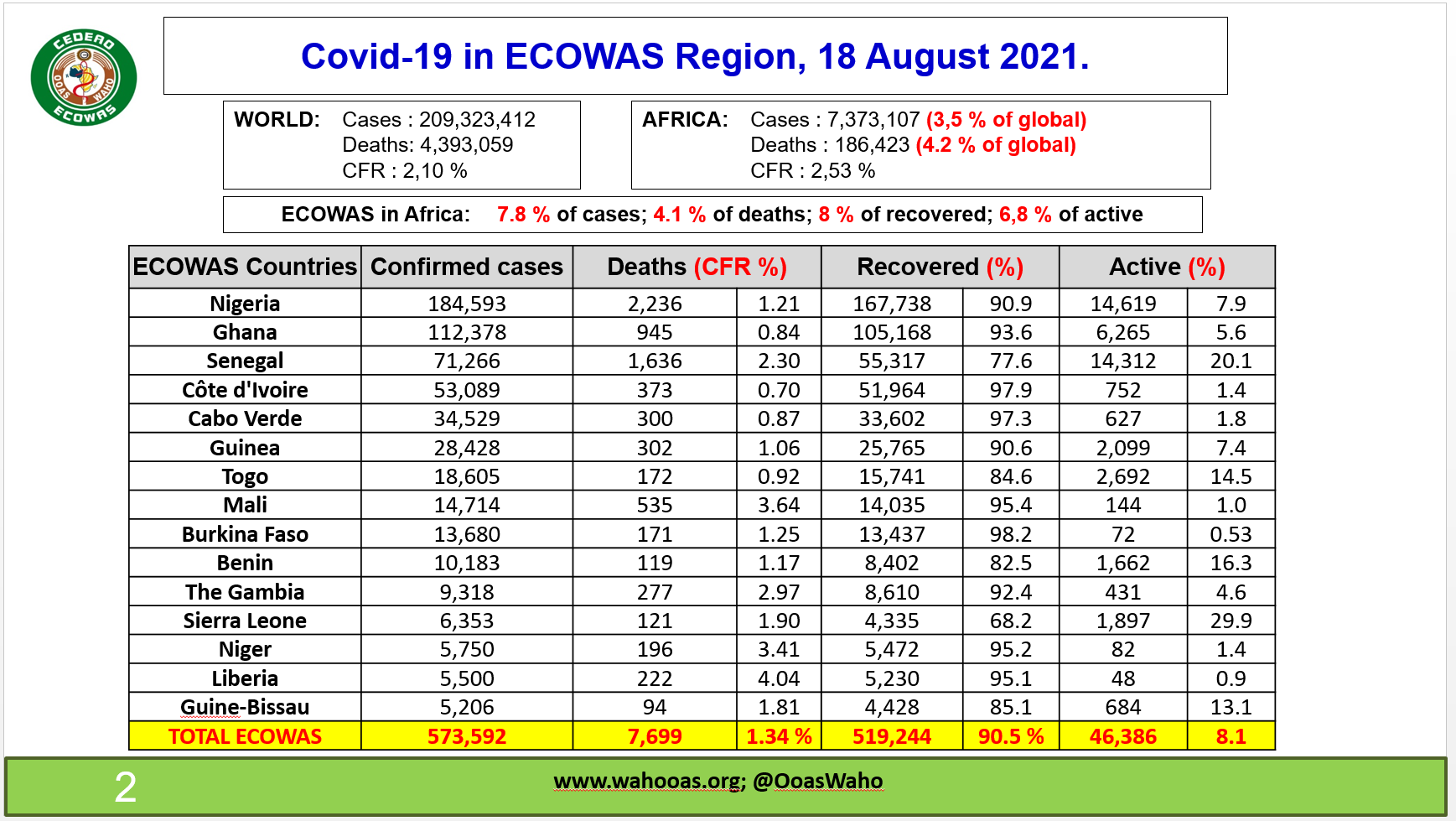 Coronavirus - ECOWAS: COVID-19 update (18 August 2021)