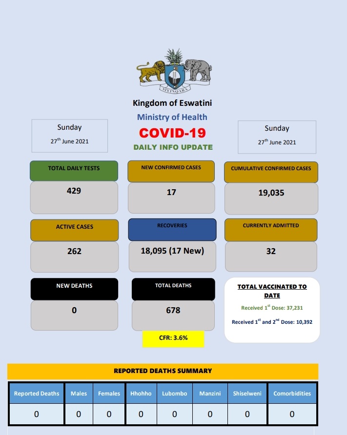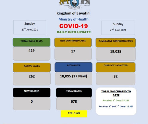 Coronavirus - Eswatini: COVID-19 daily info update (27 June 2021)