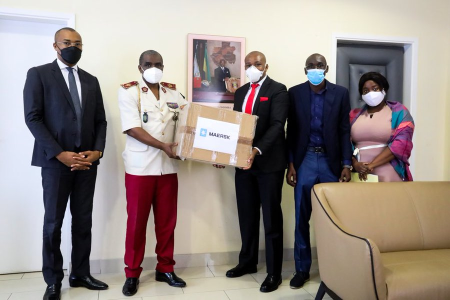 Le groupe Maersk, représenté par le directeur général de Maersk Gabon, M. Daniel Gitau Mwangi, a effectué un don d'équipements de protection individuelle au COPILcoronavirus composé de 25000 masques, 200 lunettes, 260 gels, 400 combinaisons et 400 surchaussures.