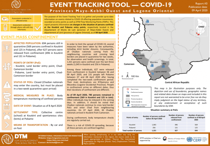 L'outil de suivi des urgences a pour but de collecter et de fournir des informations à jour sur les évènements liés au COVID-19 enregistrés aux points d’entrée ainsi qu’aux points de suivi des flux (FMP). Ce rapport présente des informations sur le déploiement d’équipes médicales et la mise en œuvre de mesures sanitaires du 1er au 8 avril 2020 à Boundoufourdou et Missira.