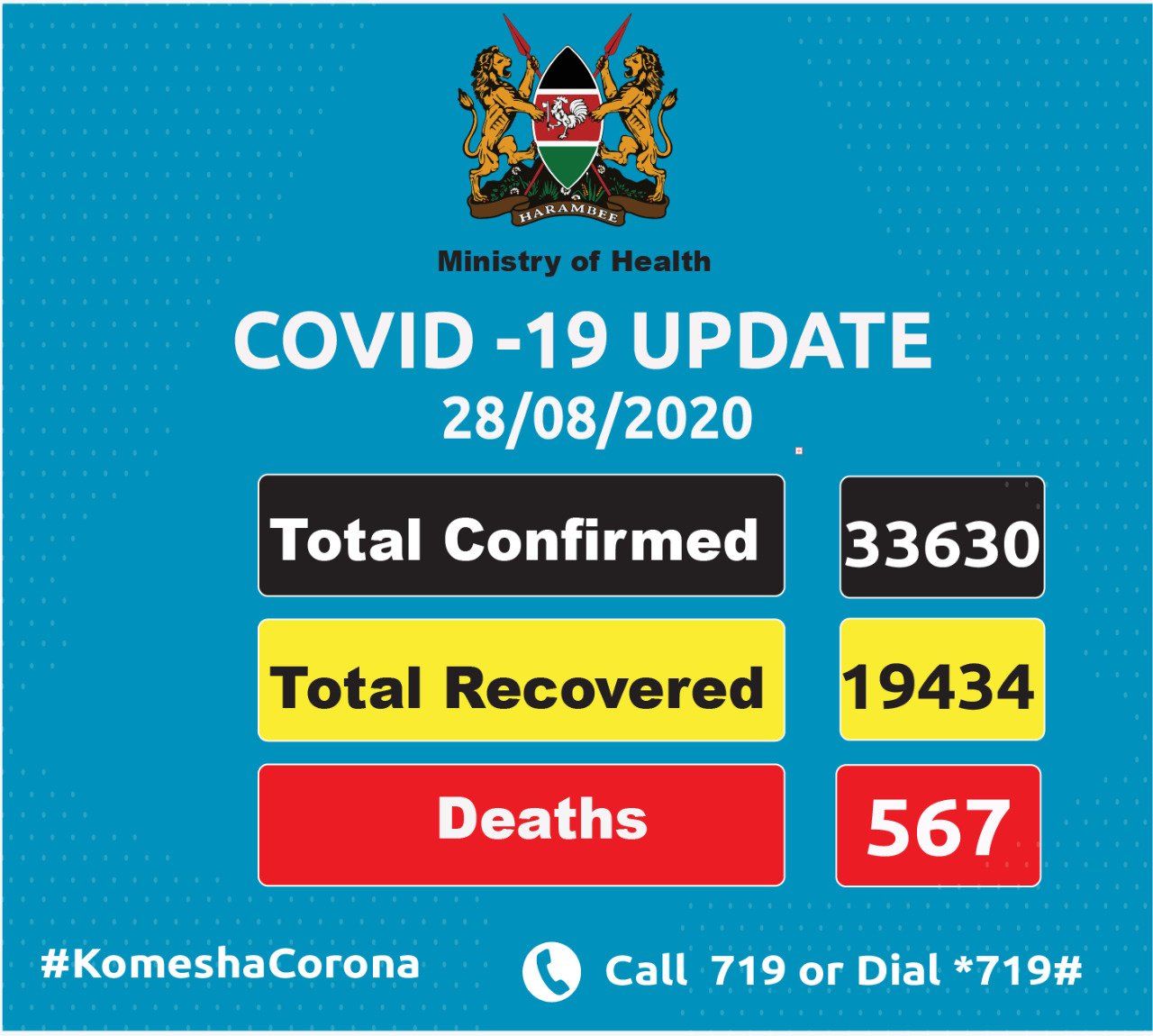 Coronavirus - Kenya: COVID-19 Update (28 August 2020) NAIROBI, Kenya, August 28, 2020/APO Group/ -- Total confirmed: 33630 Total recovered: 19434 Deaths: 567 Distributed by APO Group on behalf of Ministry of Health, Kenya.