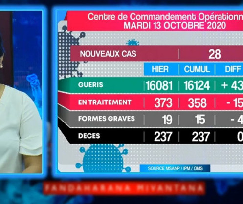 Ce 13 Octobre 2020, 28 nouveaux cas sont enregistrés dont 2 dans la région Analamanga, 3 dans la région Alaotra, 1 dans la région Ihorombe, 1 dans la région Haute Matsiatra, 2 dans la région Vatovavy Fitovinany, 1 dans la région Atsimo Andrefana, 3 dans la région de Menabe, 1 dans la région de Boeny, 13 dans la région de Sava et 1 dans la région de Sava. 43 cas de guérison ont été également annoncés par le Pr Vololontiana. A ce jour, 358 personnes sont encore en traitement dont 15 présentent des formes graves. Par ailleurs, aucun décès lié au Covid-19 n’a été signalé ces dernières 24h.