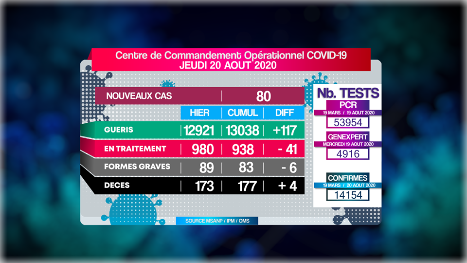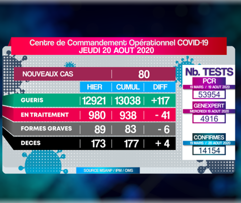 Ce jeudi 20 août, le Centre de Commandement Opérationnel covid-19 a signalé 80 nouveaux cas positifs au coronavirus sur les 510 tests effectués ces dernières 24 heures. La majorité ont été répertoriés dans la région Analamanga avec 52 cas, 1 autre localisé à Itasy, 10 cas à Alaotra Mangoro, 2 cas à Matsiatra Ambony, 3 cas à Sofia, 8 cas à Diana et 3 cas à Menabe. Les contaminations recensées depuis l’apparition de cette pandémie comptent désormais 14154 cas. Parmi eux, il ne reste plus que 938 cas actifs, dont 83 patients présentent une forme grave. En outre,117 patients ont recouvré la santé ce qui porte à 13038 le nombre total des personnes guéries, a également communiqué Pr VOLOLONTIANA Hanta lors de son rapport journalier sur l’évolution de la pandémie de covid-19 dans le territoire malagasy. Officiellement, le bilan fait état de 177 décès dont 4 ont été enregistrés ce jour.