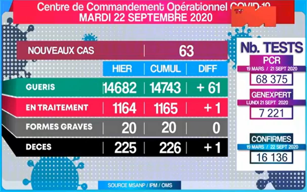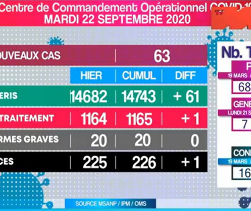 Selon les données statistiques du Centre de commandement opérationnel (CCO) Covid-19 de ce 22 Septembre 2020, les nouveaux cas des dernières 24h sont au nombre de 63 sur 598 tests effectués, portant à 1165 le nombre de cas actifs actuels dont 20 présentent des formes graves. La majorité des nouveaux cas sont localisés dans la région de Sava avec 25 cas, suivi de Alaotra Mangoro avec 13 cas, la région Diana avec 9 cas, la région vatovavy Fitovinany avec 3 cas, la région Analamanga avec 6 cas et la région de Boeny avec 1 cas.