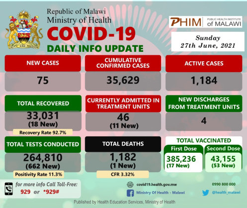 Coronavirus - Malawi: COVID-19 Daily Info Update (27 June 2021)