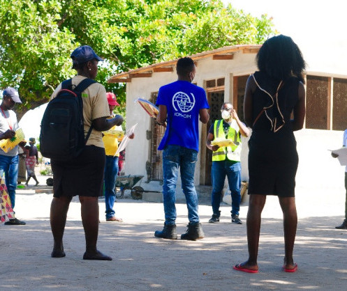 • In IOM teams in Mandruzi resettlement site, in Sofala Province, Mozambique, train site leadership committee on COVID-19 prevention to pass on messages to site residents (IOM/William Baang)