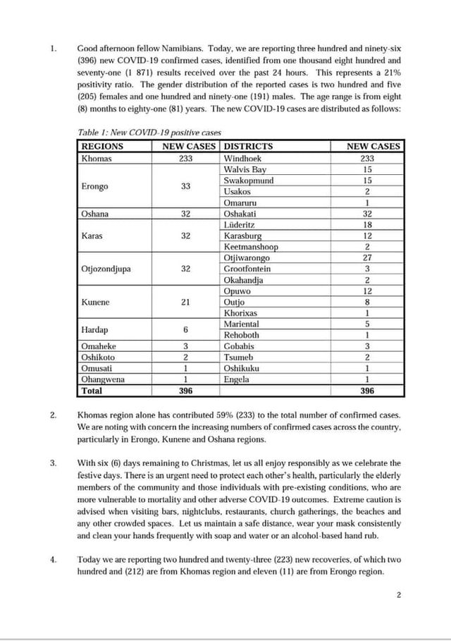 Honorable Minister Dr. Kalumbi Shangula announced 396 new COVID-19 cases , 2 COVID-19 deaths and 223 Recoveries.