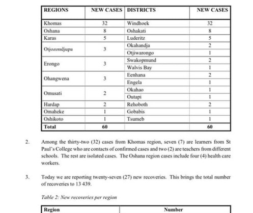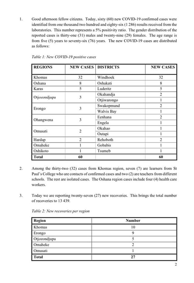 Honorable Minister Dr. Kalumbi Shangula announced 60 new COVID-19 cases, 1 COVID-19 death and 27 Recoveries.