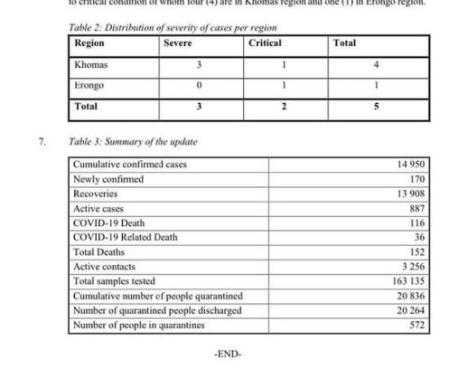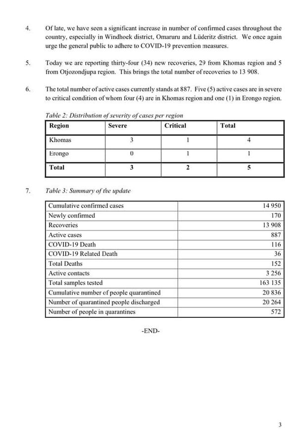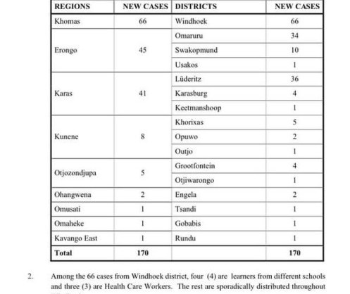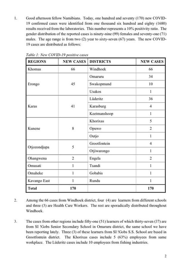 Honorable Minister Dr. Kalumbi Shangula announced 170 new COVID-19 cases and 34 Recoveries. No deaths reported.