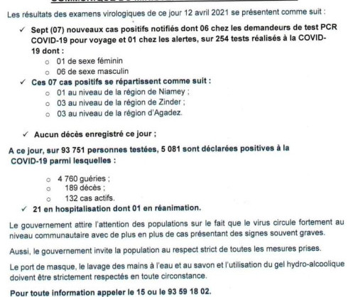 • Coronavirus - Niger : mise à jour COVID-19 (12 avril 2021)