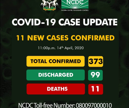 As at 11:00 pm 14th April there are 373 confirmed cases of #COVID19 reported in Nigeria. 99 have been discharged with 11 deaths.