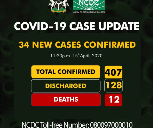 As at 11:20 pm 15th April there are 407 confirmed cases of #COVID19 reported in Nigeria. 128 have been discharged with 12 deaths.