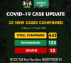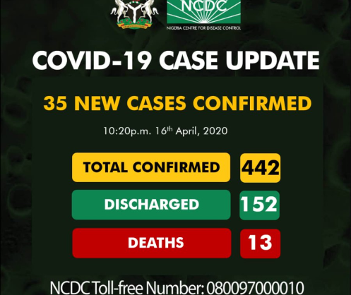 As at 10:20 pm 16th April there are 442 confirmed cases of #COVID19 reported in Nigeria. 152 have been discharged with 13 deaths.