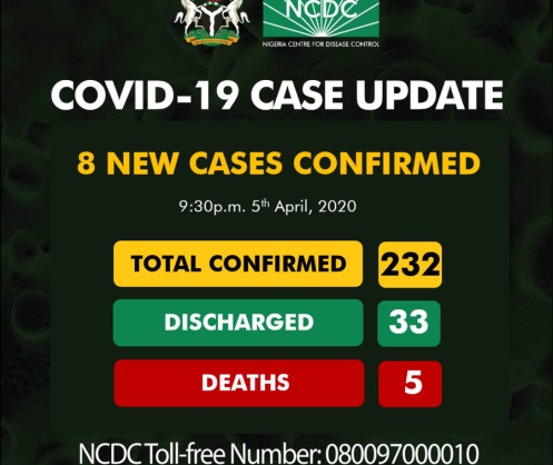 As at 09:30 pm 5th April there are 232 confirmed cases of #COVID19 reported in Nigeria. Thirty-three have been discharged with five deaths.