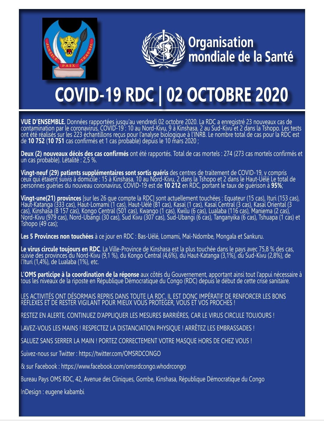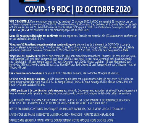 COVID-19 RDC : Données du 02 oct 2020 avec 23 nouveaux cas de contamination par le coronavirus dont 10 au Nord-Kivu, 9 à Kinshasa, 2 au Sud-Kivu & 2 dans la Tshopo sur les 223 tests réalisés. Le nombre total de cas pour la RDC est de 10 752 (10 751 cas confirmés et 1 cas probable).