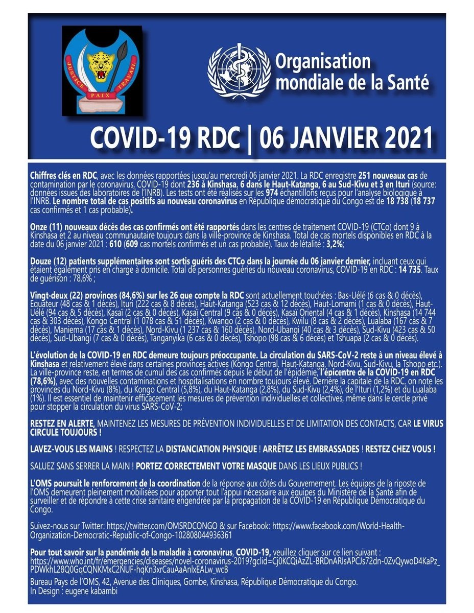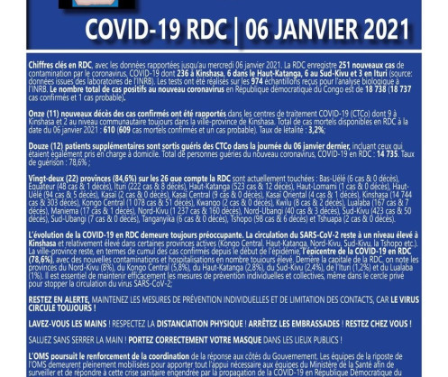 Au 06 janvier 2021, la RDC enregistre 251 nouveaux cas de contamination par le coronavirus , COVID-19 dont 236 à Kinshasa , 6 dans le La Province du Haut-Katanga , 6 au Sud-Kivu et 3 en Ituri.