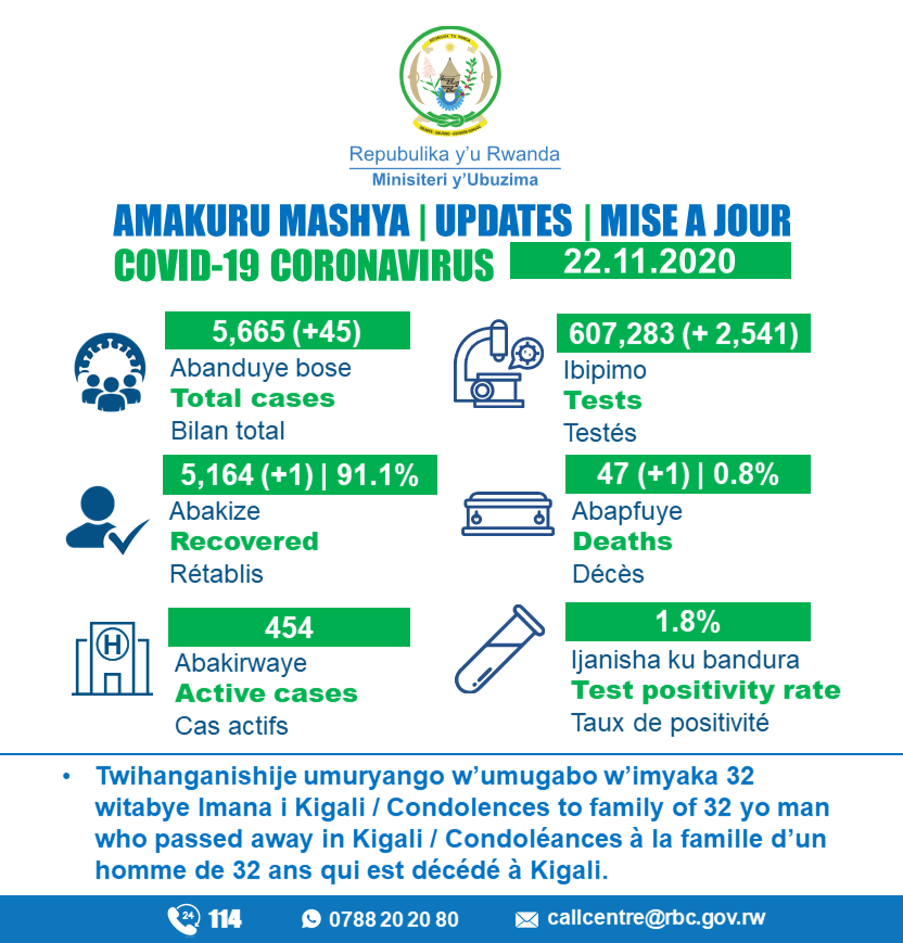 • Coronavirus - Rwanda : Mise à jour du cas COVID-19 (22 novembre 2020)