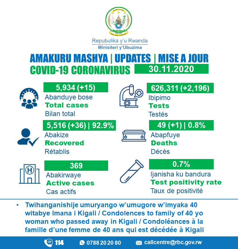 • Coronavirus - Rwanda : Mise à jour du cas COVID-19 (30 novembre 2020)