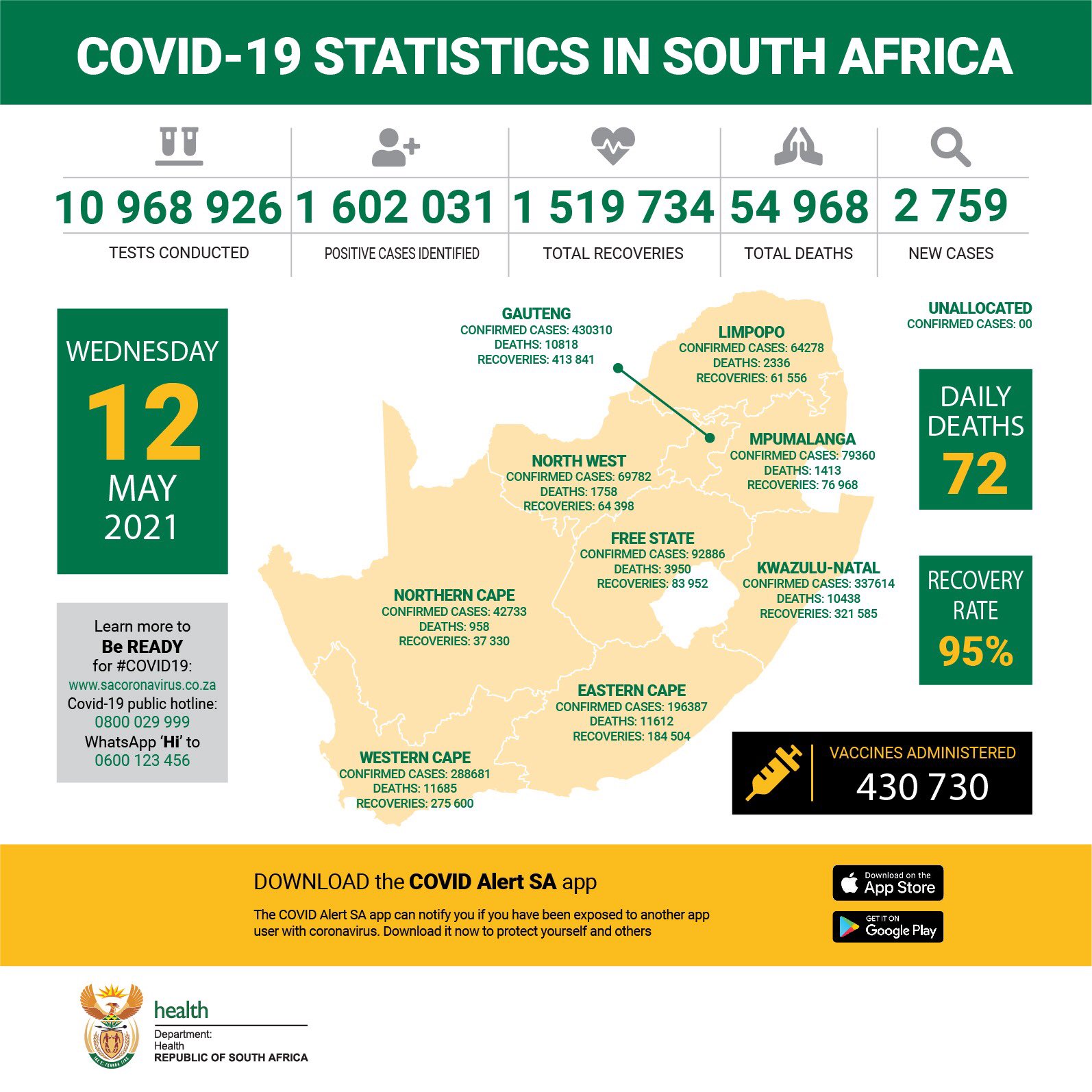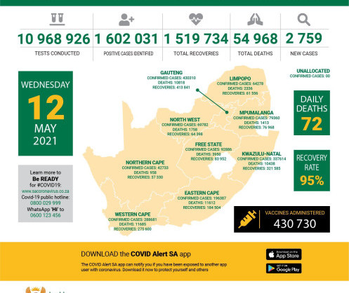 Coronavirus - South Africa: COVID-19 Statistics in South Africa (12 May 2021)