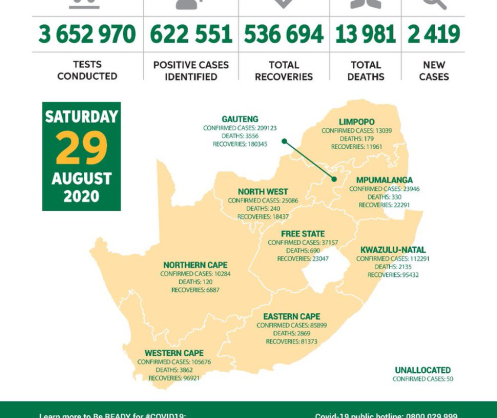 Coronavirus - South Africa: COVID-19 statistics in South Africa (29 August 2020)