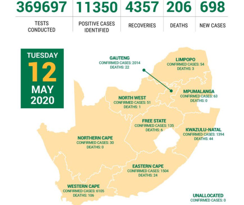 Coronavirus - South Africa: COVID-19 Statistics in South Africa as at 12 May 2020