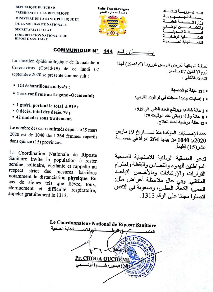 Coronavirus - Tchad : Communique - la situation épidémiologique du COVID-19 au Tchad du 07 septembre 2020