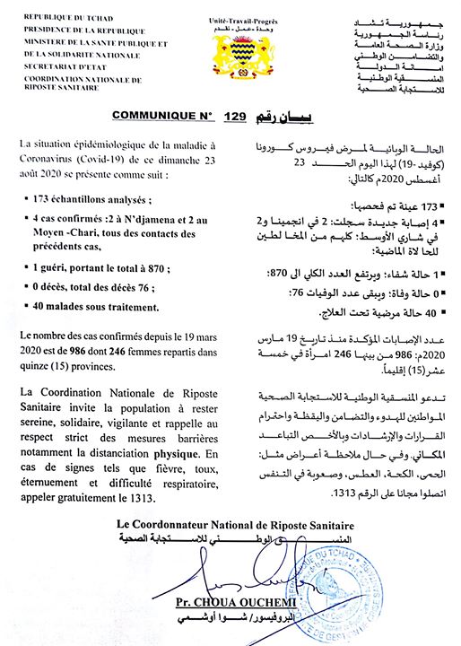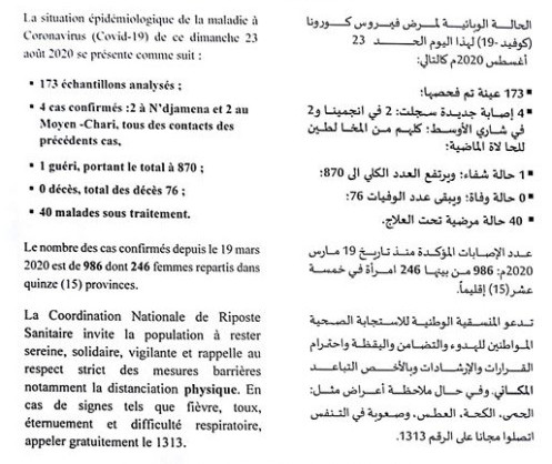 • Coronavirus - Tchad : Communique - la situation épidémiologique du covid-19 au Tchad du 23 août