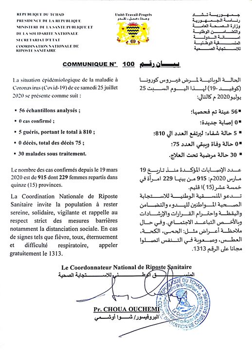• Coronavirus - Tchad : Communique - La situation épidémiologique du COVID-19 au Tchad du 25 juillet 2020