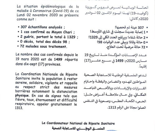 • Coronavirus - Tchad : La situation épidémiologique du COVID-19 au Tchad du 02 novembre 2020