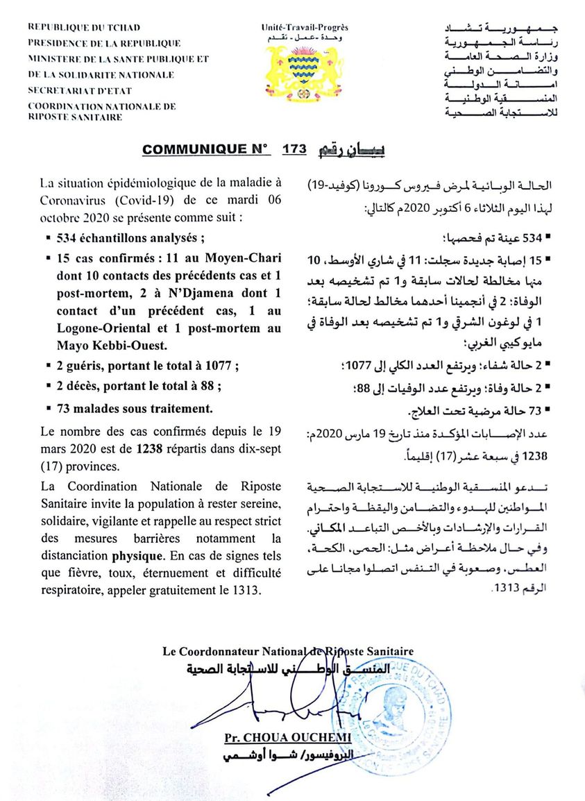 Coronavirus - Tchad : La situation épidémiologique du COVID-19 au Tchad du 06 octobre 2020