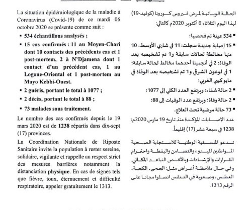 • Coronavirus - Tchad : La situation épidémiologique du COVID-19 au Tchad du 06 octobre 2020