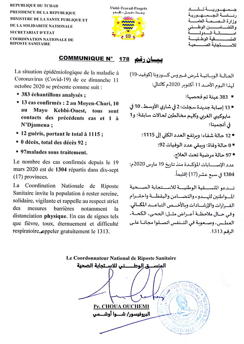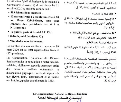 • Coronavirus - Tchad : La situation épidémiologique du COVID-19 au Tchad du 11 octobre 2020