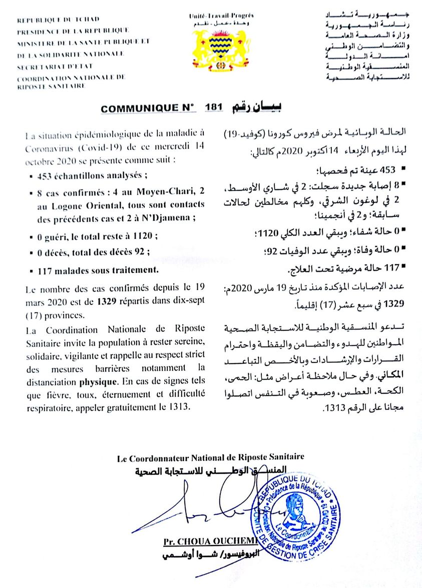 La situation épidémiologique de COVID-19 au Tchad du 14 octobre 2020 se présente comme suit :