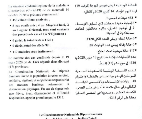 • Coronavirus - Tchad : La situation épidémiologique du COVID-19 au Tchad du 14 octobre 2020