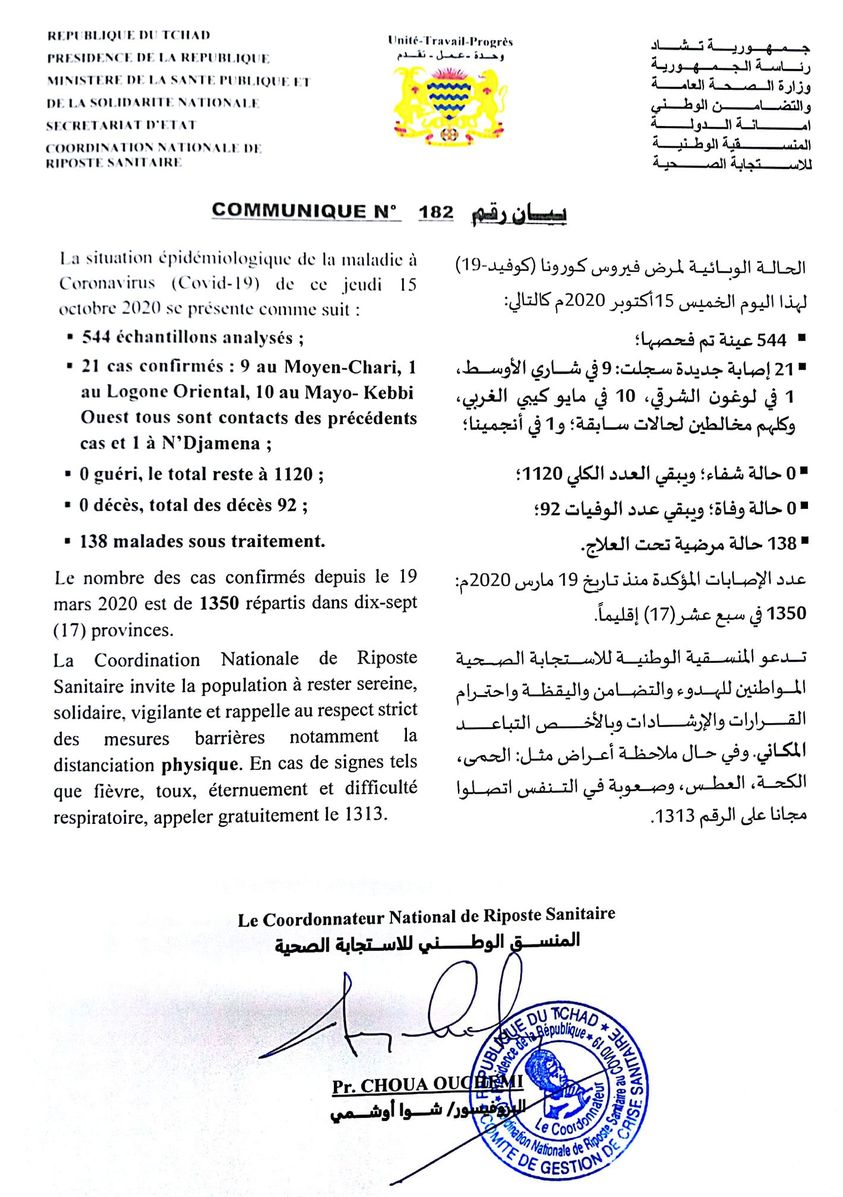 La situation épidémiologique de COVID-19 au Tchad du 15 octobre 2020 se présente comme suit :