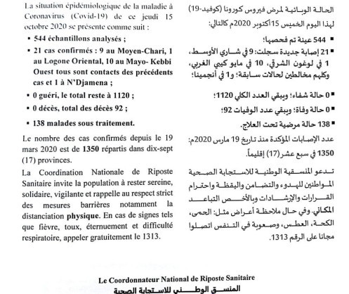 • Coronavirus - Tchad : La situation épidémiologique du COVID-19 au Tchad du 15 octobre 2020