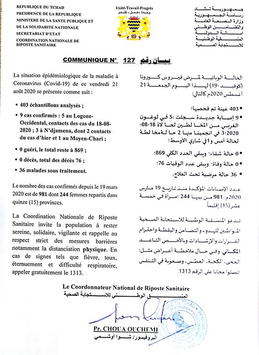 • Coronavirus - Tchad : La situation épidémiologique du COVID-19 au Tchad du 21 août 2020