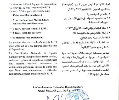 • Coronavirus - Tchad : La situation épidémiologique du COVID-19 au Tchad du 29 octobre 2020