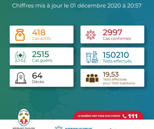 • Coronavirus - Togo : Chiffres mis à jour le 1 décembre 2020 à 20:57